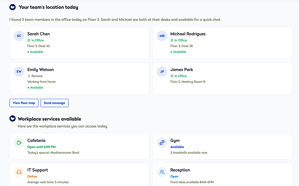 Instantly coordinate in-office schedules and reserve team-wide workspaces following seating preferences.