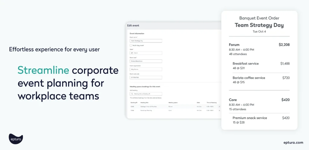 • Event management in Eptura Engage unifies room bookings, resources, and services under a single event — complete with the ability to generate Banquet Event Order reports — allowing workplace, hospitality, and facilities teams to coordinate workflows seamlessly in one view.